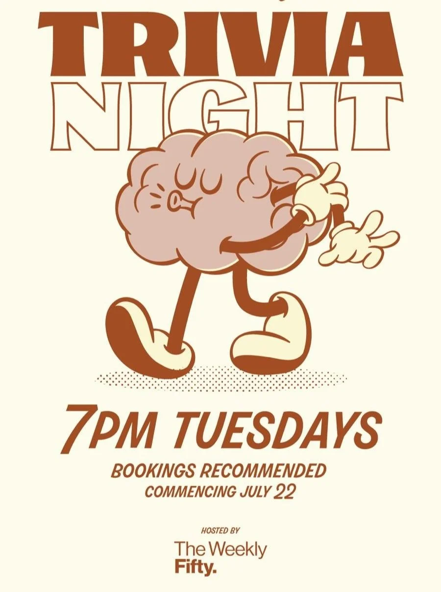 Think you’ve got what it takes to take the crown? Rally your team and join us every Tuesday from 7pm for a fun-filled night of trivia, laughs, and great wine — hosted by the legends at The Weekly Fifty.